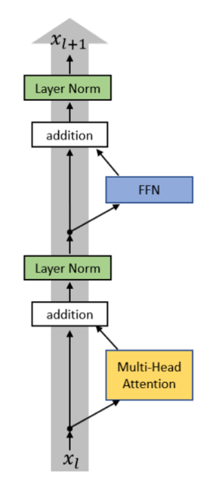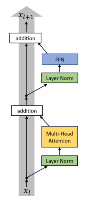 • Here, input $x_l$ is first sent to the attention module. Then, output of the attention is summed with the residual stream.