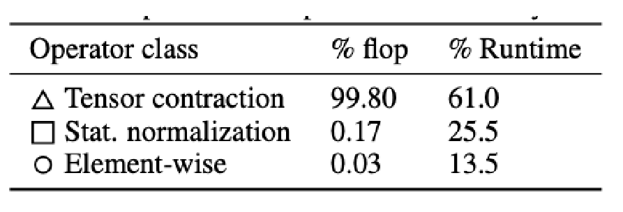 • Even though most of the FLOPs happen during the matrix multiplication, bias term and normalization operation can still increase the runtime due to required data movement operations:
