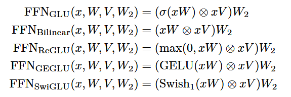• That is why gated models use smaller internal dimensions by about 2/3, so the number of parameters for FFN is roughly the same.